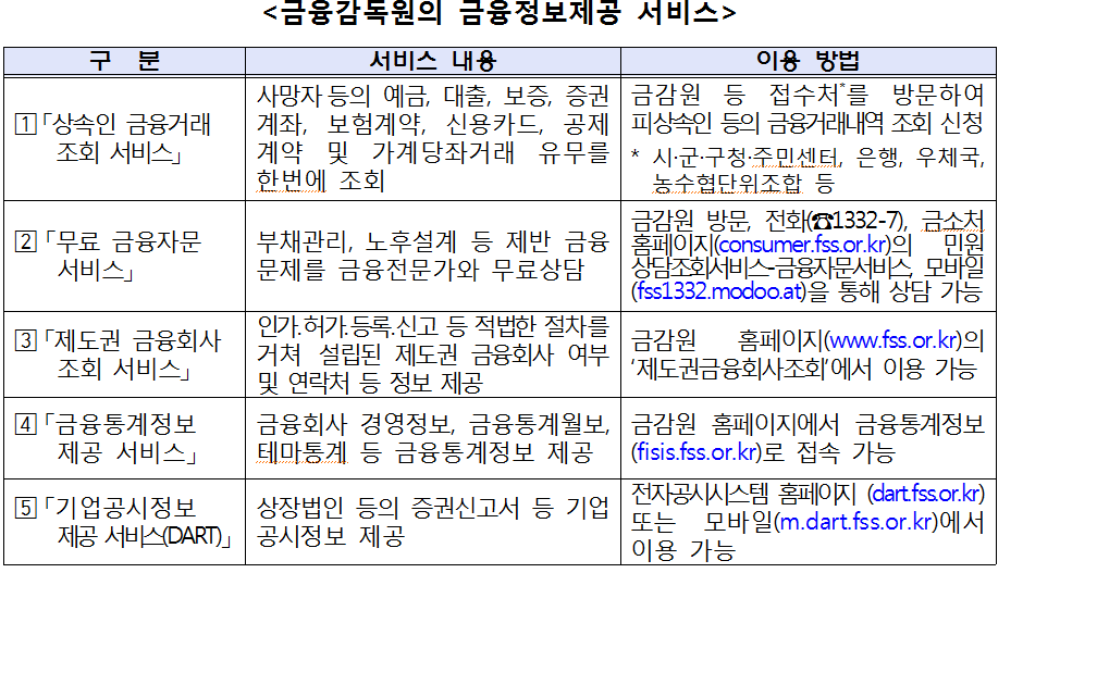 금융감독원은 “국민체감 20大 금융관행 개혁” 등을 통해 개선된 사항을 중심으로 금융소비자가 잘 알고 활용하면 유익한 25가지 금융서비스를 5차례에 걸쳐 안내하고 있습니다. 그 일환으로 제4편에서는 ①「상속인 금융거래 조회 서비스」, ②「무료 금융자문 서비스」, ③「제도권 금융회사 조회 서비스」, ④「금융 통계정보 제공 서비스」, ⑤「기업공시정보 제공 서비스(DART)」를 소개하고 있으며 주요 서비스 내용 및 이용 방법은 다음과 같습니다.