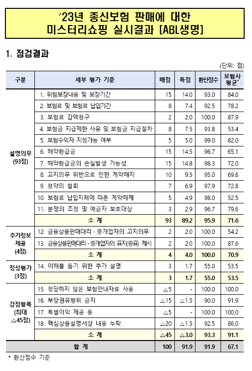 회사는 금융감독원에서 발표한 2023년 종신보험 판매에 대한 미스터리쇼핑 실시결과에서 업계 평균보다 24점 높은 91.1점을 기록했다.